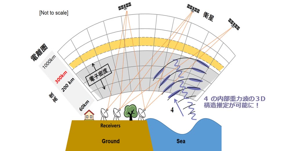 千葉大学大学院理学研究院の服部克巳教授、同大国際高等研究基幹のSong Rui(宋 鋭)特任助教らの研究グループは、中国地震局地震予測研究所と台湾国立中央大学との共同研究で、日本GEONETのGNSS観測網を活用して、2011年東北地方太平洋沖地震(東日本大震災、M9)直後に発生した電離圏擾乱の3次元構造を再構築することに成功しました。地震・津波によって発生する多様な大気波動が電離圏電子密度に与える影響を3次元的に可視化した本研究成果は、従来の2次元観測(TEC)の限界を突破するものであり、地球の岩石圏‐大気圏‐電離圏の相互作用に関する理解を大きく前進させるものです。また、津波の早期検知に応用可能な新たな指標を提示するものであり、将来的な早期警報システムの信頼性向上に寄与することが期待されます。