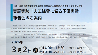 千葉大学国際高等研究基幹/環境リモートセンシング研究センターの小槻 峻司教授、富山大学 学術研究部都市デザイン学系 安永 数明教授、濱田 篤准教授、富山県立大学 工学部 吉見 和紘講師らによる共同研究チームは、内閣府によるムーンショット型研究開発制度の目標8「2050 年までに、激甚化しつつある台風や豪雨を制御し極端風水害の脅威から解放された安全安心な社会を実現」のプロジェクトの一環として行われる「人工降雪」に関する予備実験を、2026 年1 月に富山湾近海の上空にて実施いたしました。