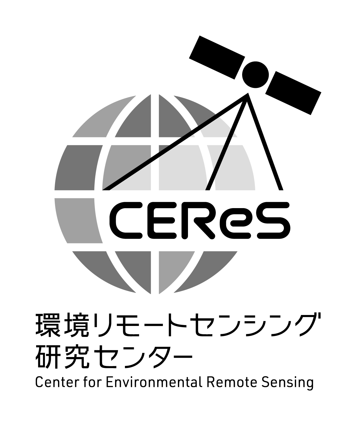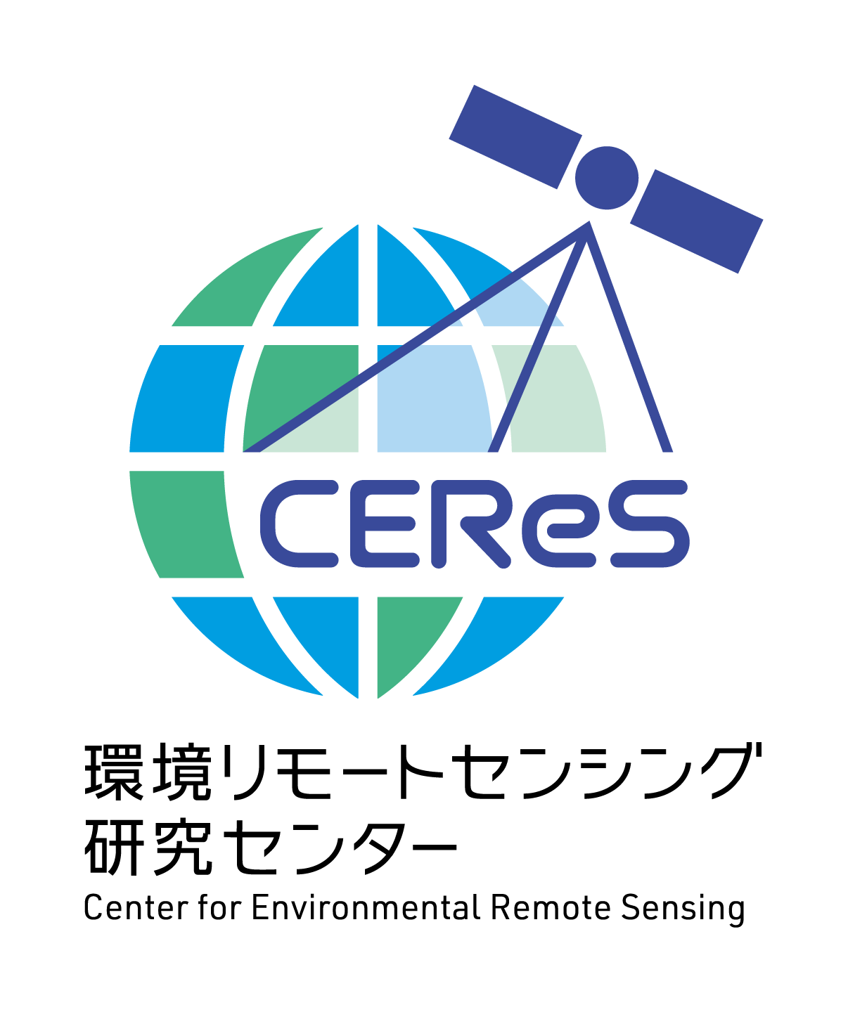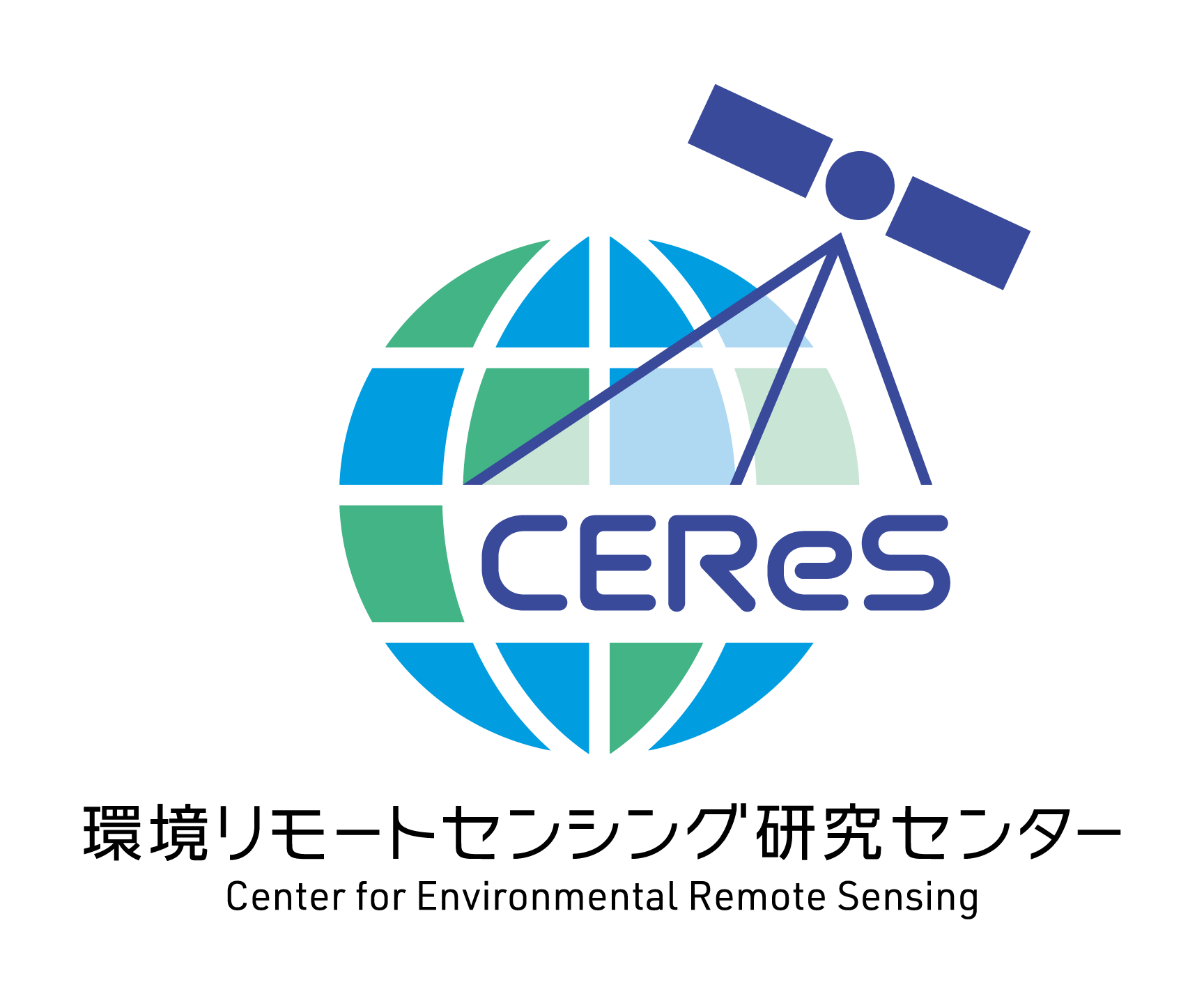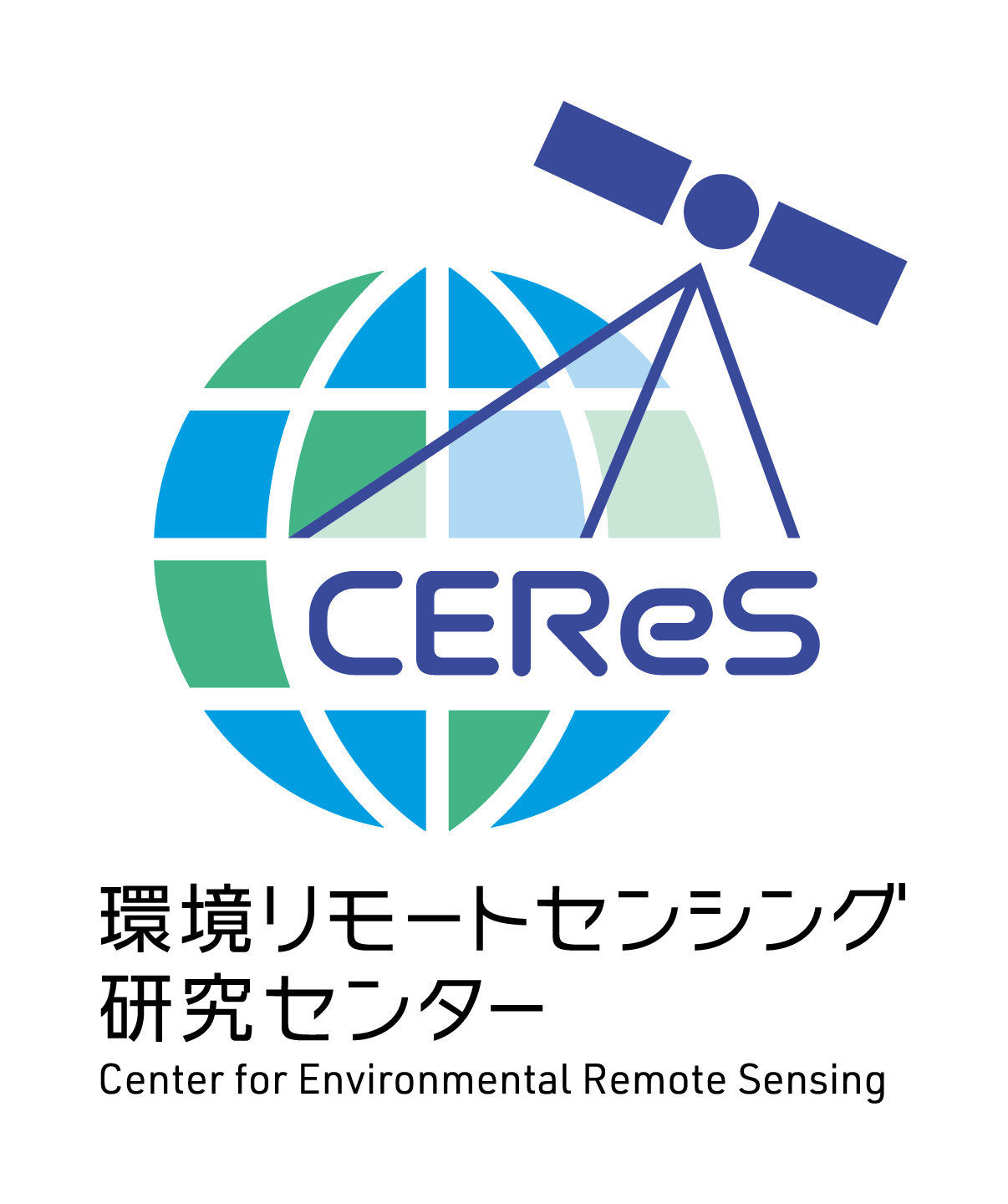 「地球」と「衛星」をモチーフにしたマークです。「方眼の目」により、リモートセンシングをイメージできるものとしました。カラーは、地球環境をイメージするグリーンとブルーとし、CEReSの文字と衛星をより目立つような配色にしています。CEReS の文字は、クールで先進的かつ、やわらかさも感じる書体となっています。マークのみでも、研究分野が多くの人に伝わるようなロゴを目指しています。