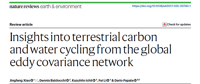 Xiao J., D. Baldocchi, K. Ichii, F. Li, D. Papale (2025) Insights into terrestrial carbon and water cycling from the global eddy covariance network. Nature Reviews Earth & Environment, https://doi.org/10.1038/s43017-025-00743-1.