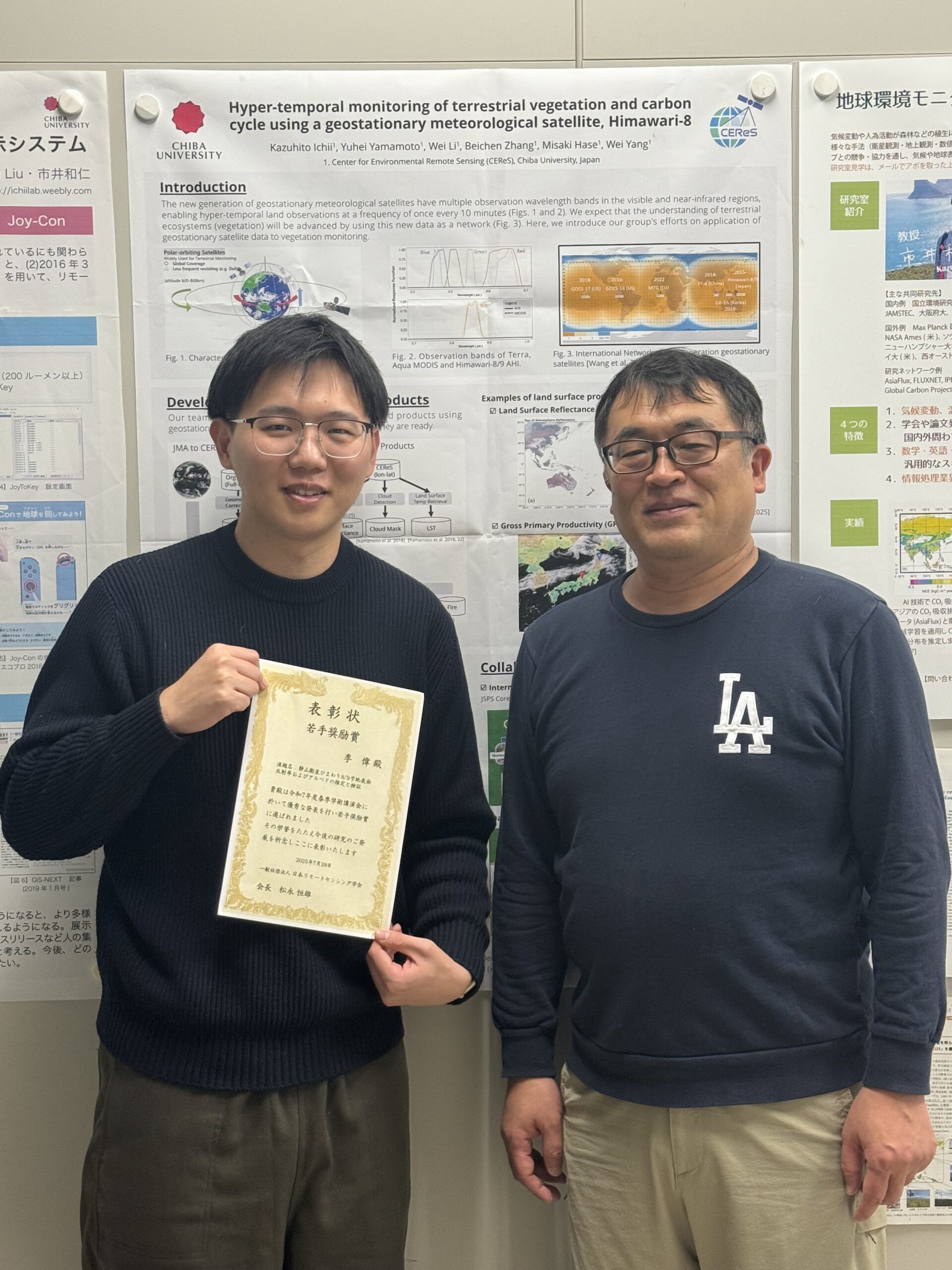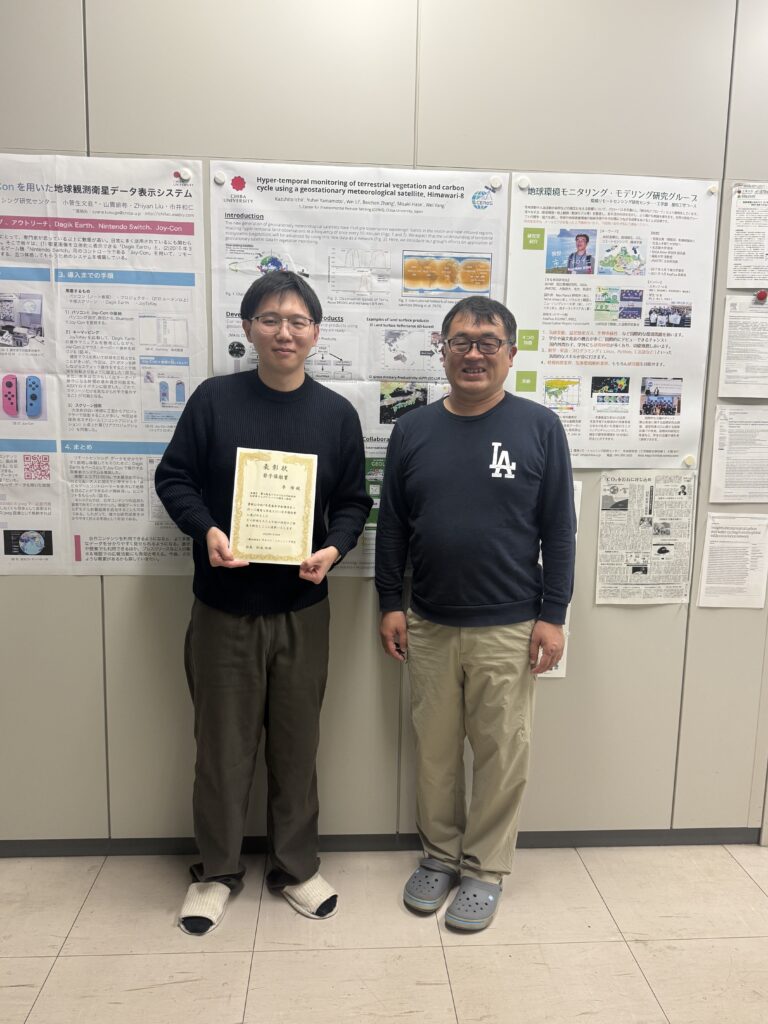 Report Li Wei Received Young Presentation Award at The 78th (Spring 2025) Conference of RSSJ. Congratulations! Report 2025.12.25 Presentation Title: 静止衛星ひまわり8/9号地表面反射率およびアルベドの推定と検証